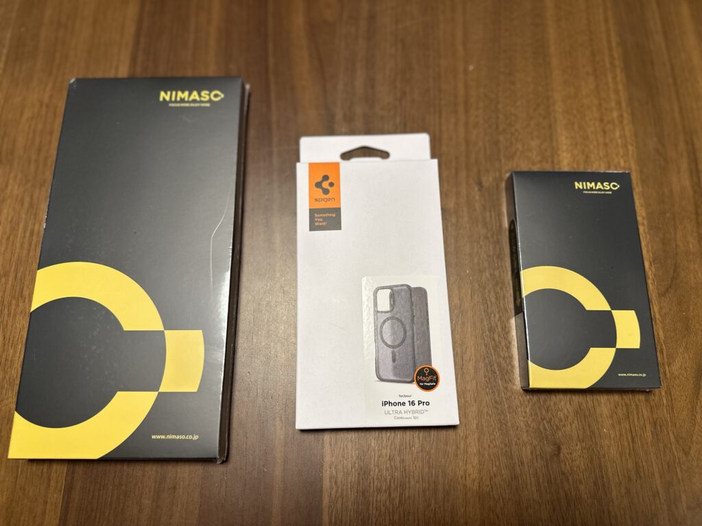 ケースやフィルム類はいつもお世話になってるspigen社のケースNIMASO社のフィルムにしました。
